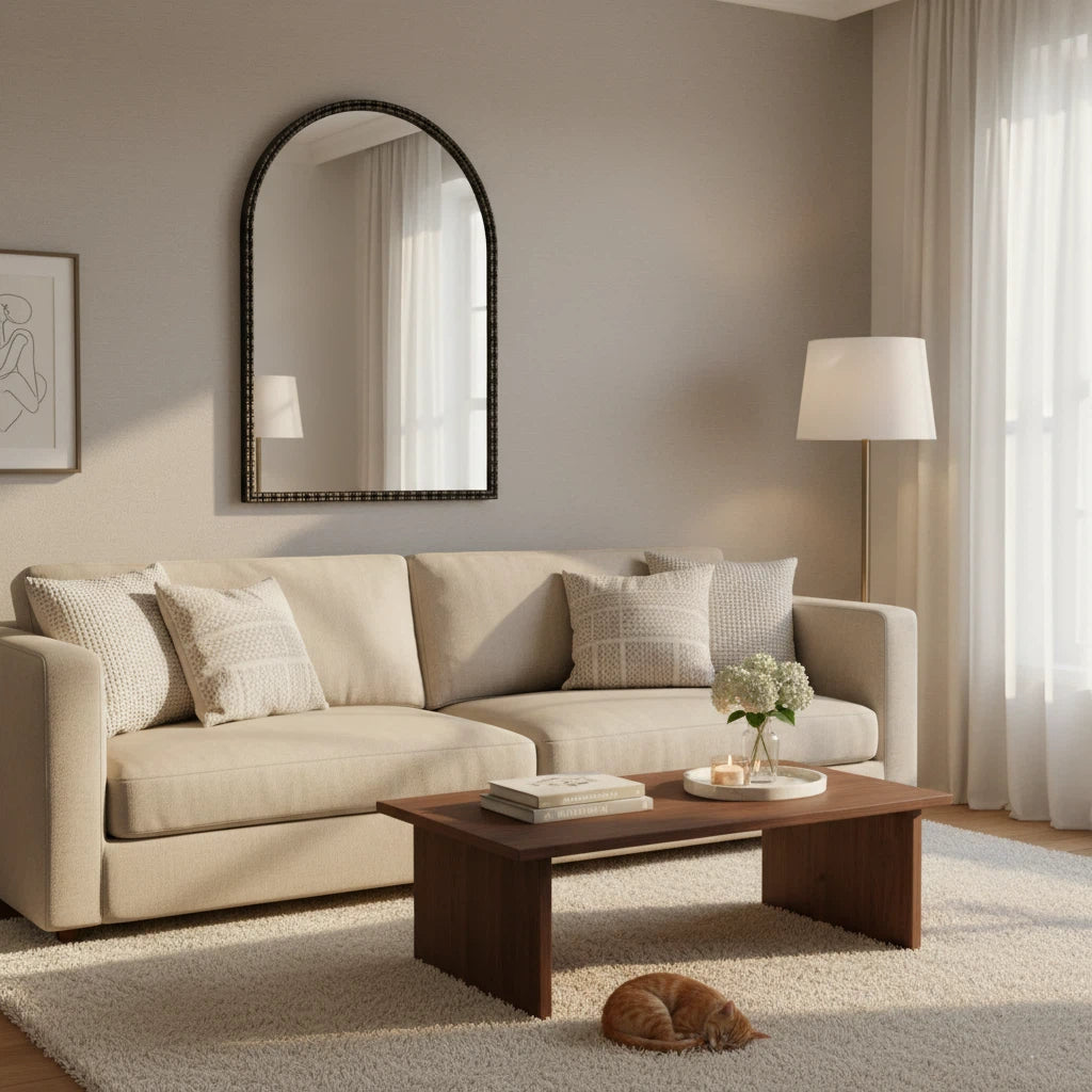 VERSATILE STYLE:Use this arched retro Roman column wall mirror to transform your living room, bedroom,bathroom,corridor or entrance passage.Its timeless design perfectly adds a touch of charm and elegance to any space.